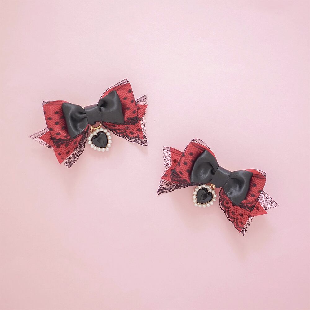 ドットのレースを重ねたサテンリボンにハートのチャームをあしらったヘアクリップです。