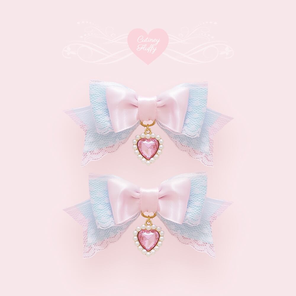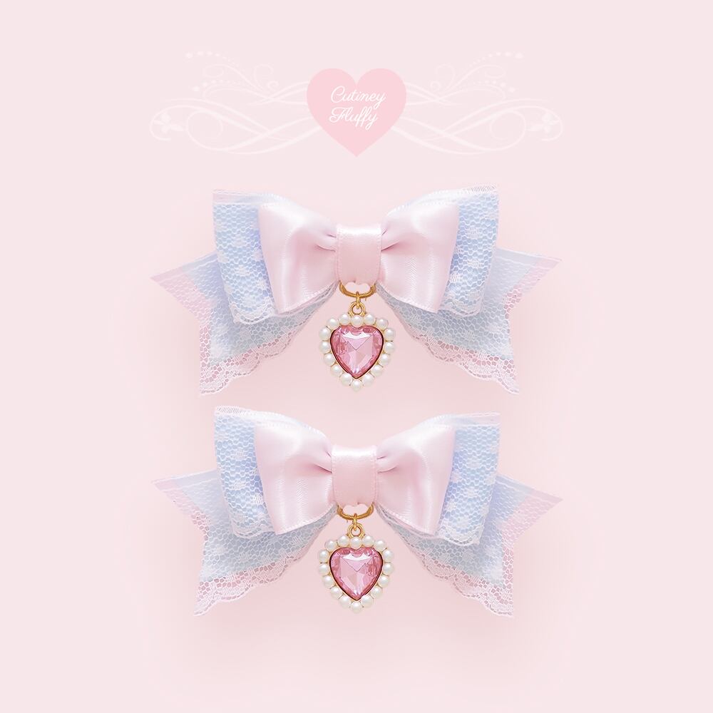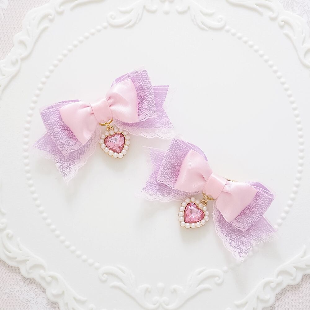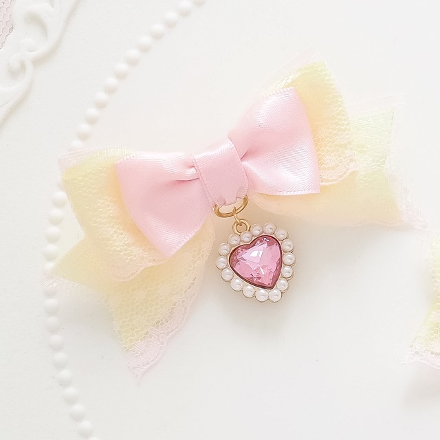 ドットのレースを重ねたサテンリボンにハートのチャームをあしらったヘアクリップです。