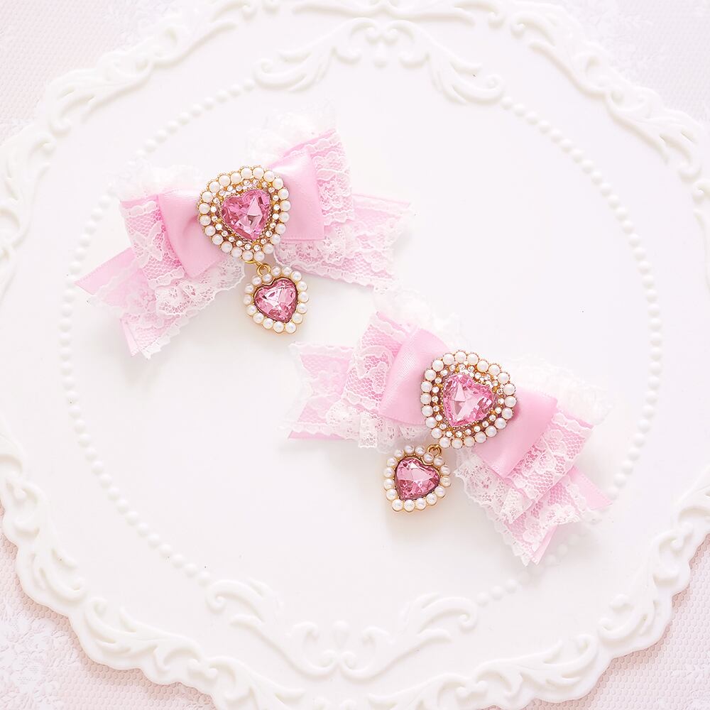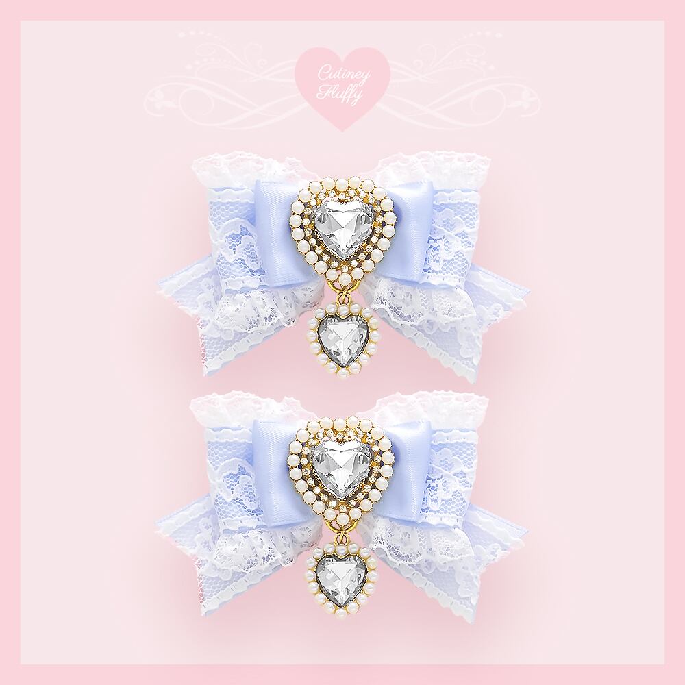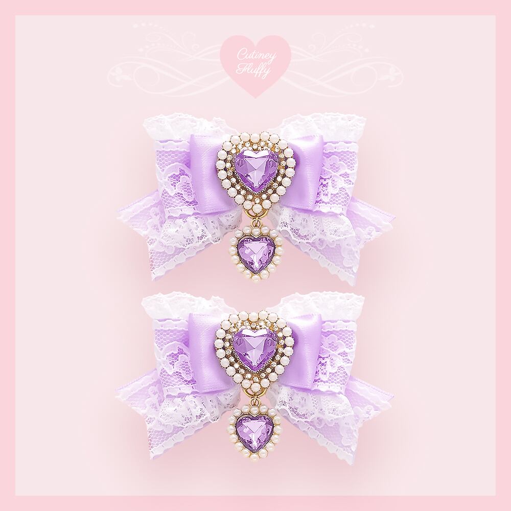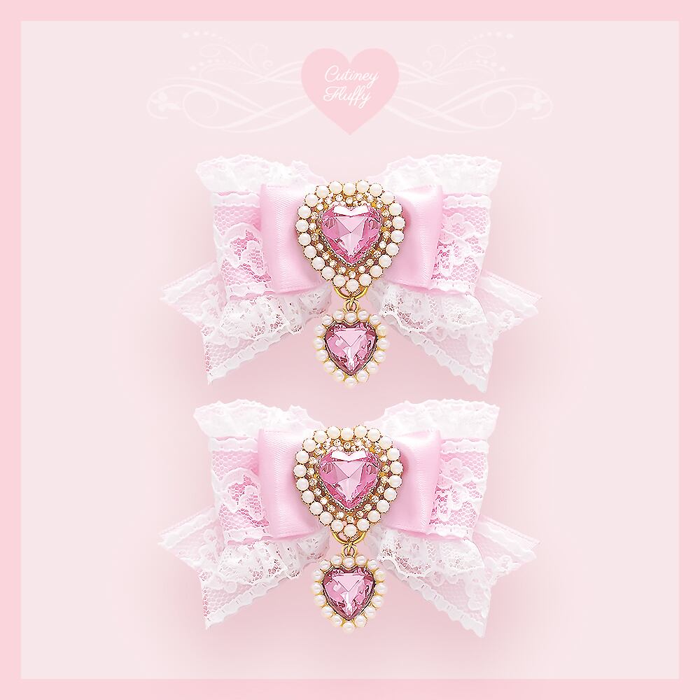 パールとラインストーンの大きなハートのビジュー、フリル、ハートのチャームをあしらったヘアクリップです。