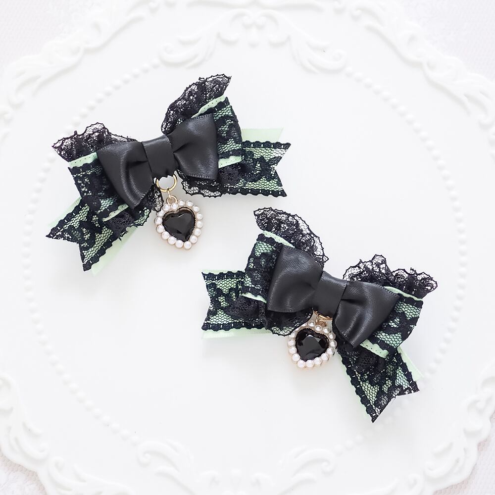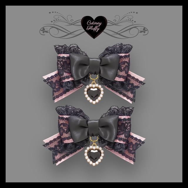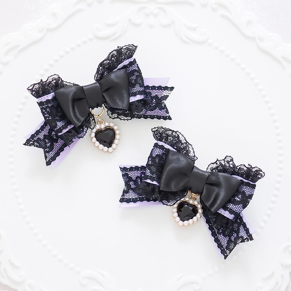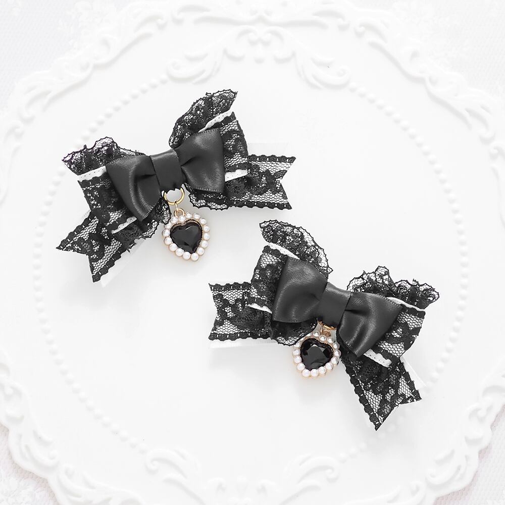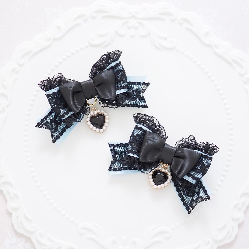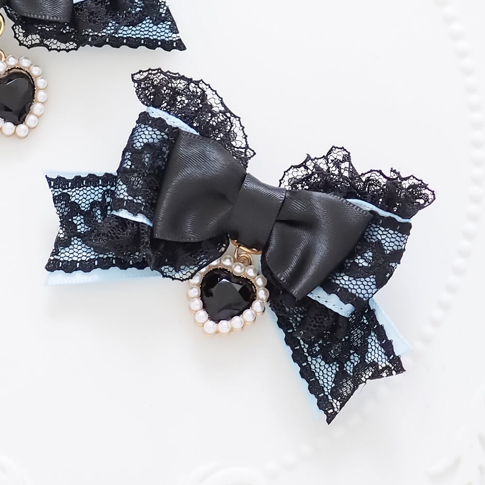 ブラックレースを重ねたサテンリボンにたっぷりのフリル、ハートのラインストーンチャームをあしらったヘアクリップです。
