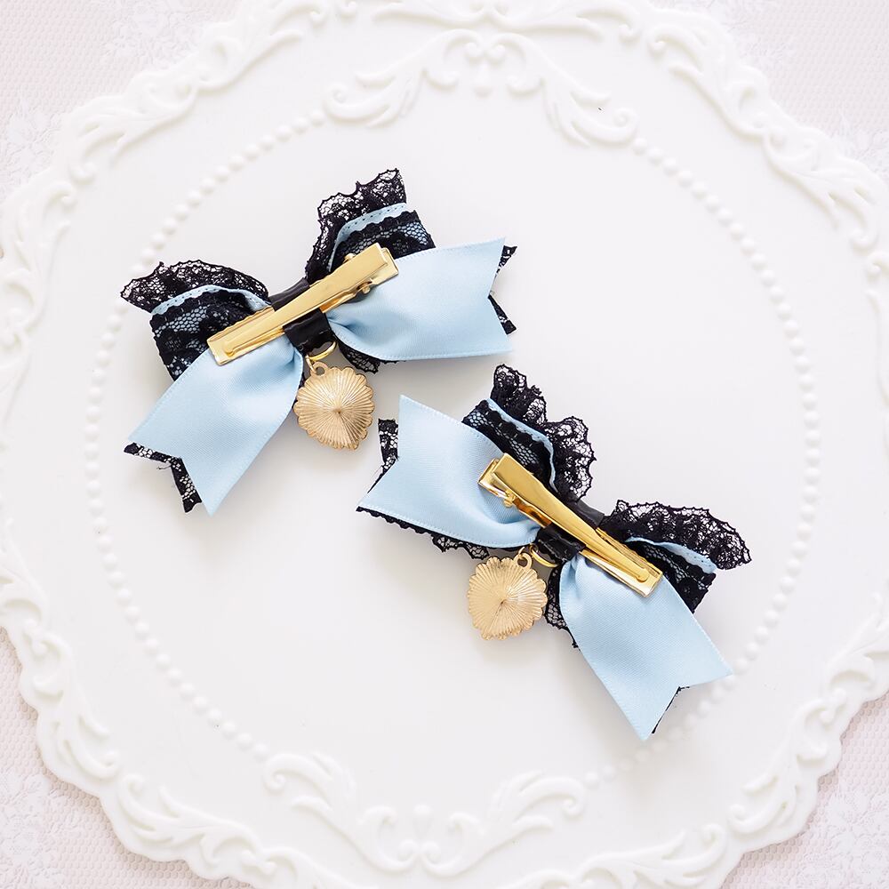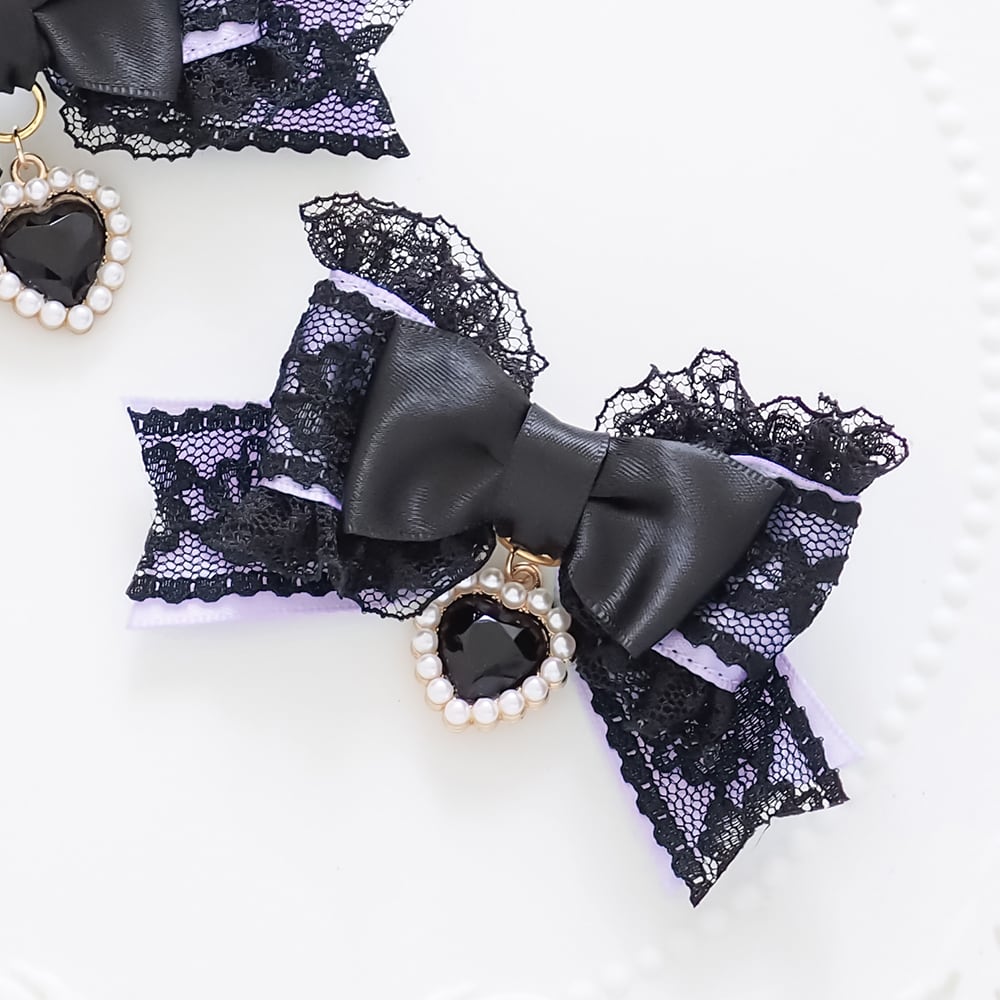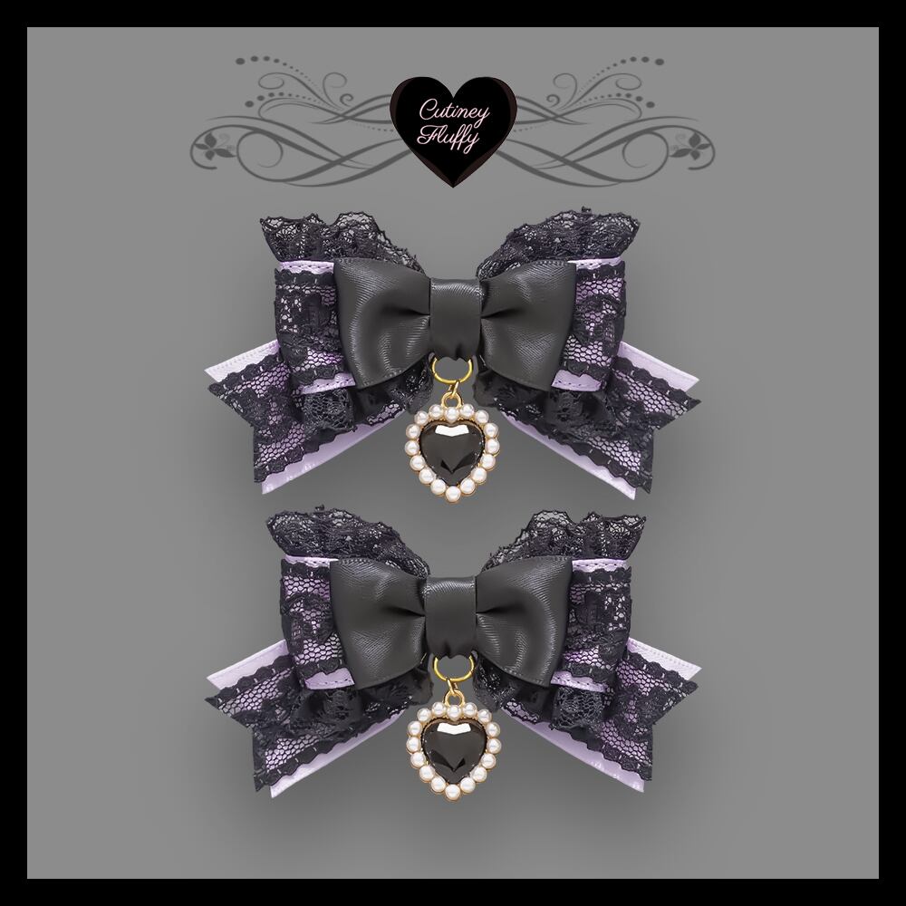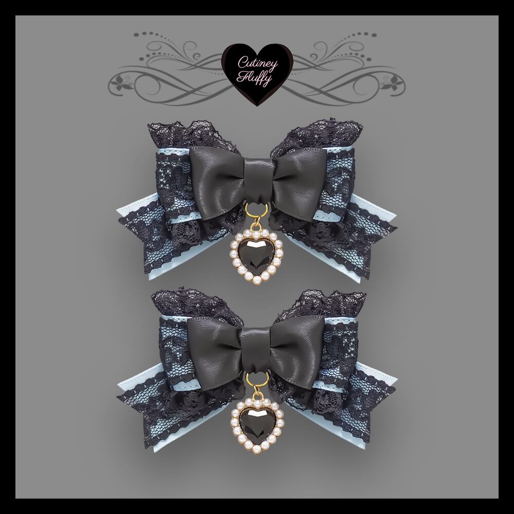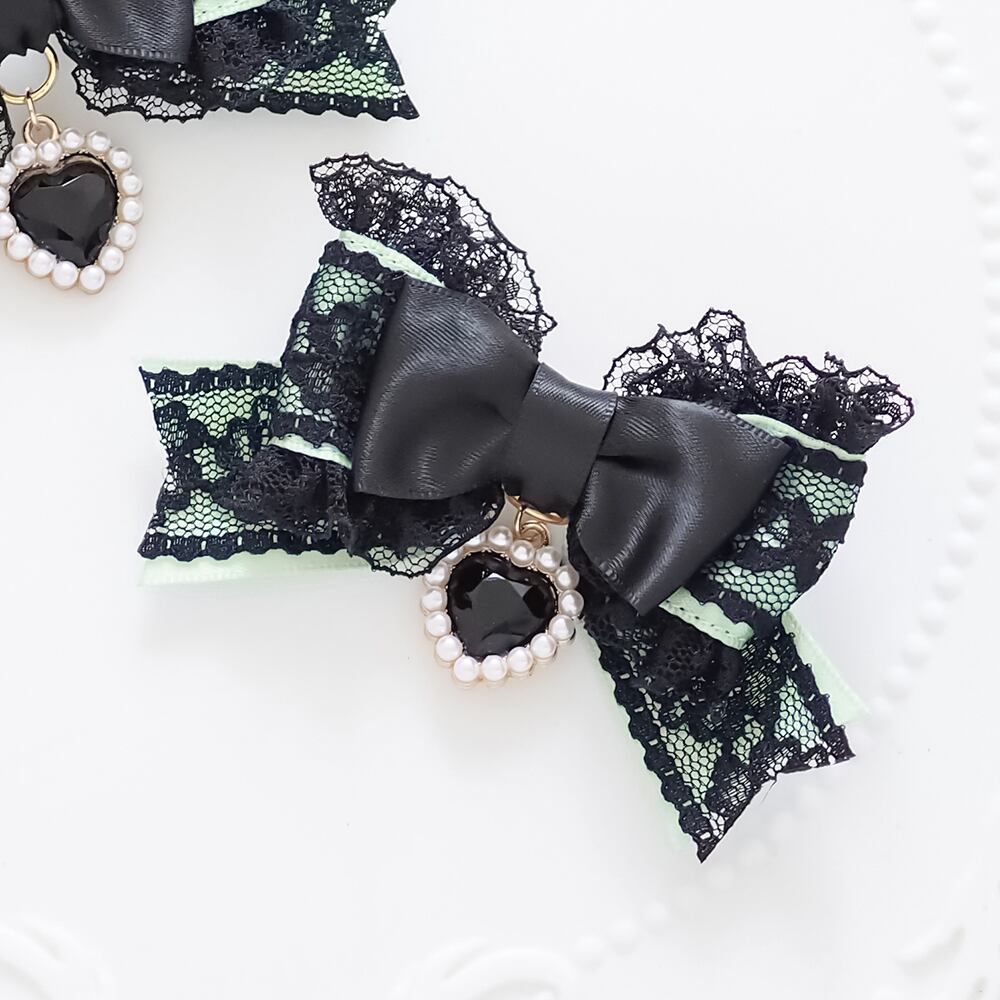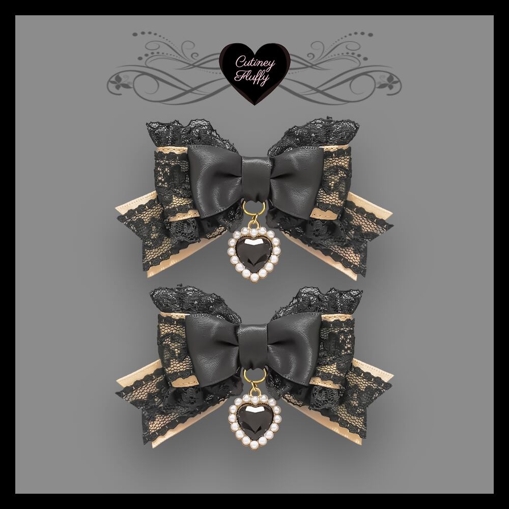 ブラックレースを重ねたサテンリボンにたっぷりのフリル、ハートのラインストーンチャームをあしらったヘアクリップです。