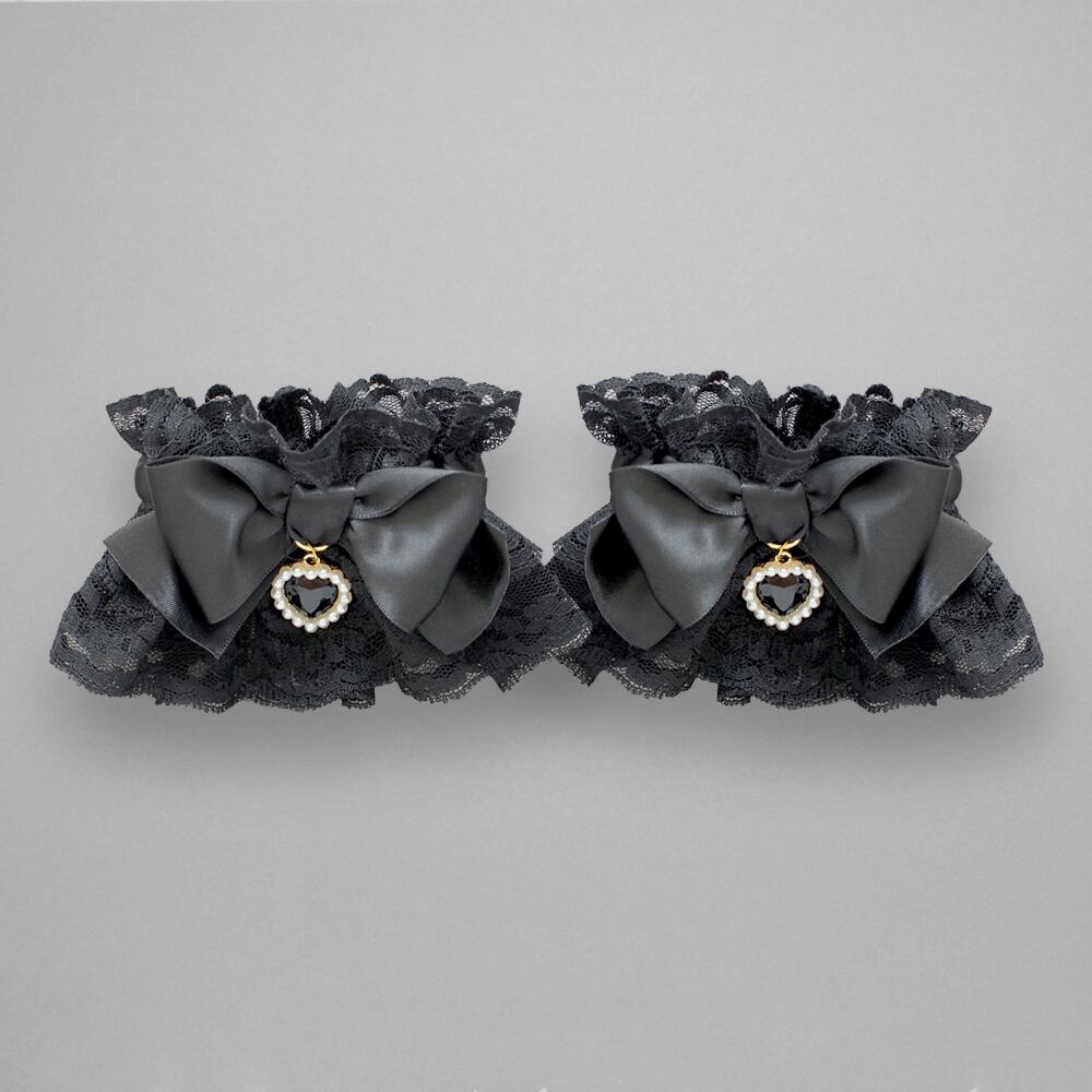 大きなリボンとハートのビジューがアクセントのレースカフス両手首分1セットでの価格です。