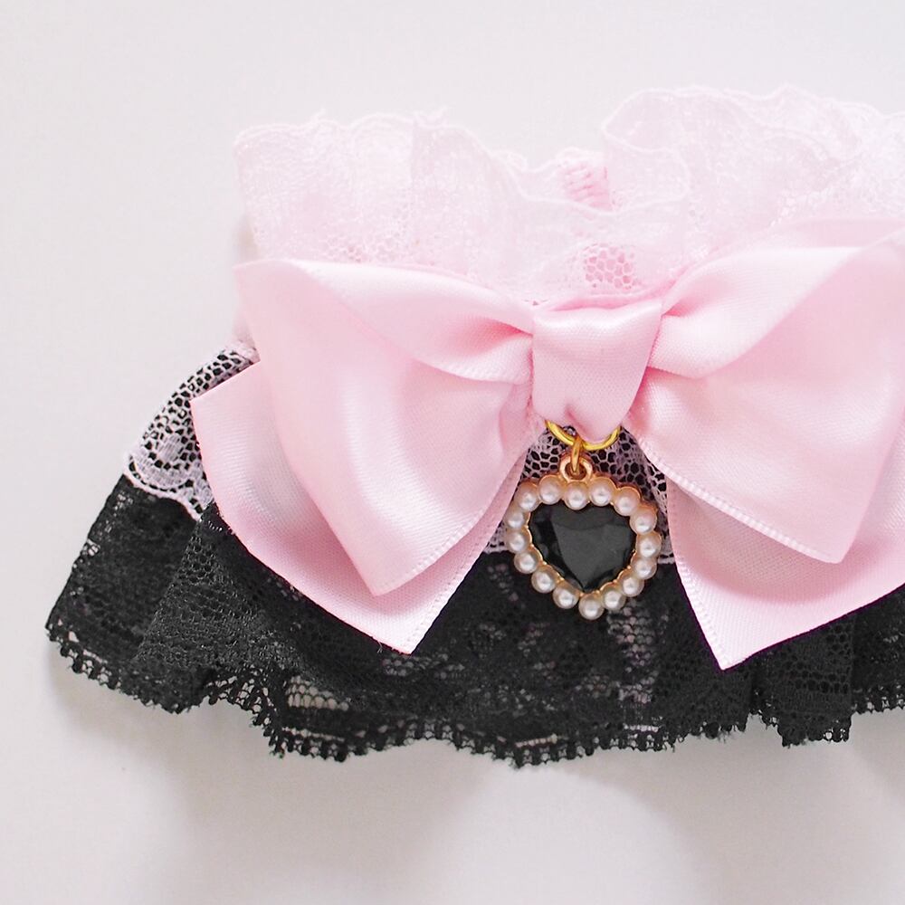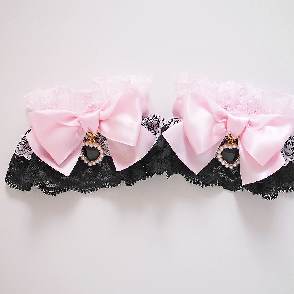 お袖留め フリル レース カフス ハート ビジュー ブラックxベビーピンク