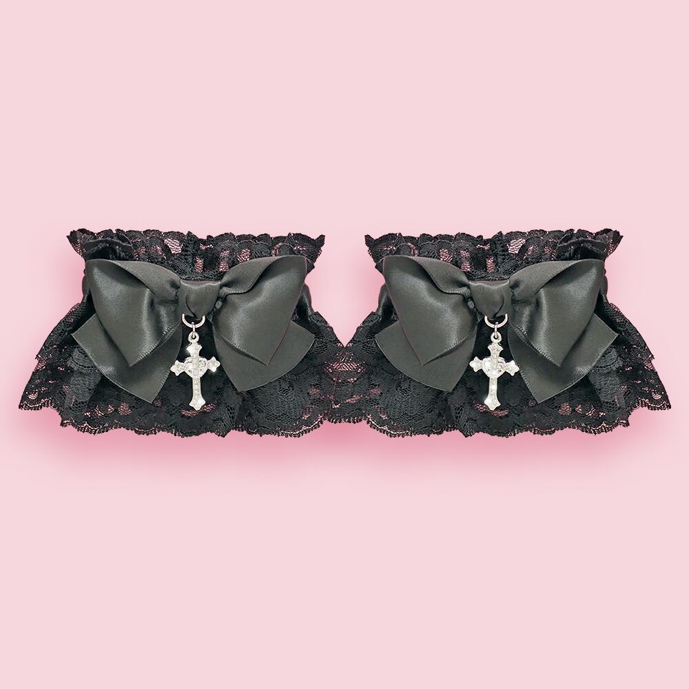 大きなリボンとラインストーンクロスチャームをあしらったフリルカフスです。