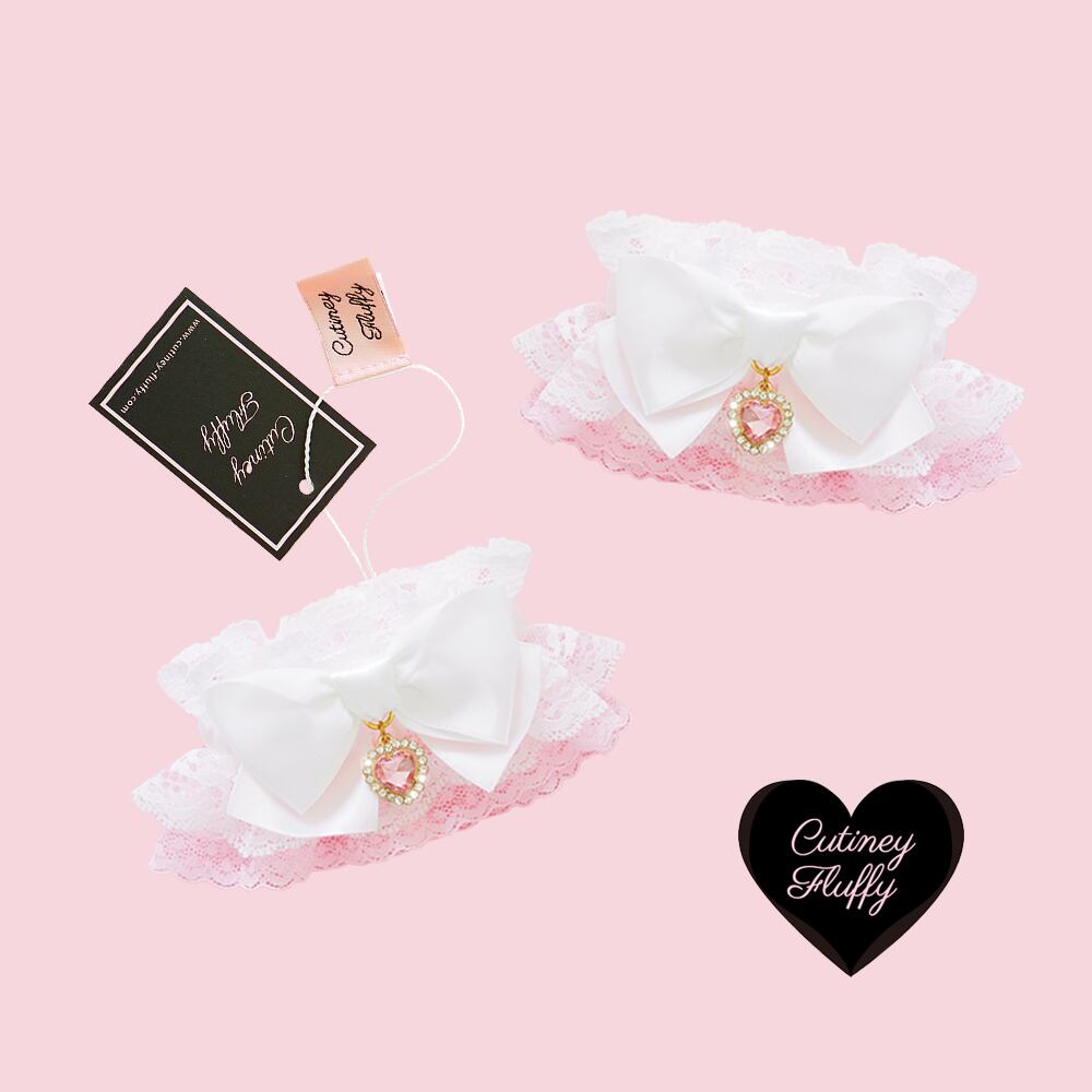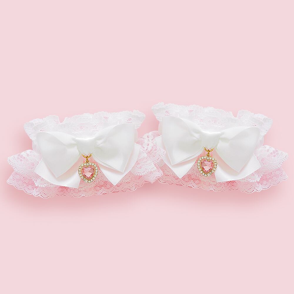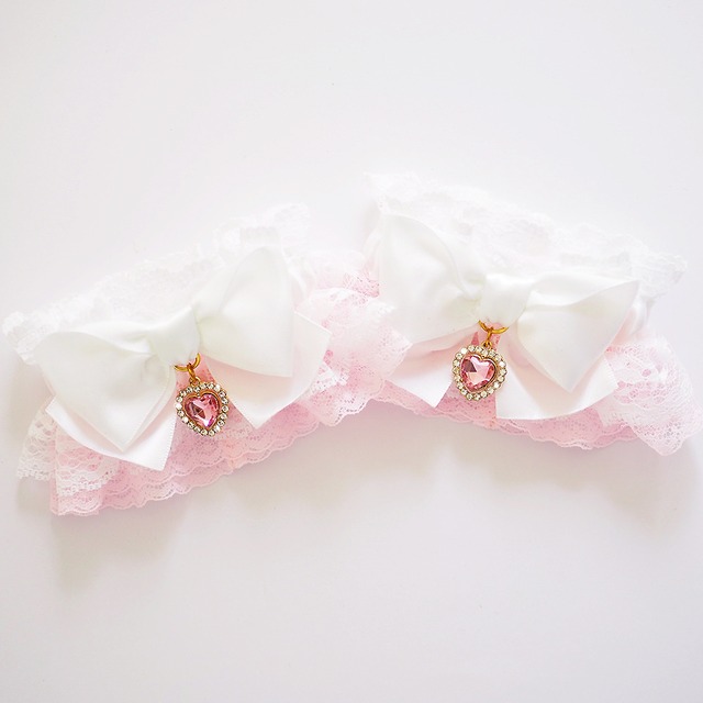 お袖留め 付け カフス ハートビジュー チャーム ピンク リボン ホワイトレース