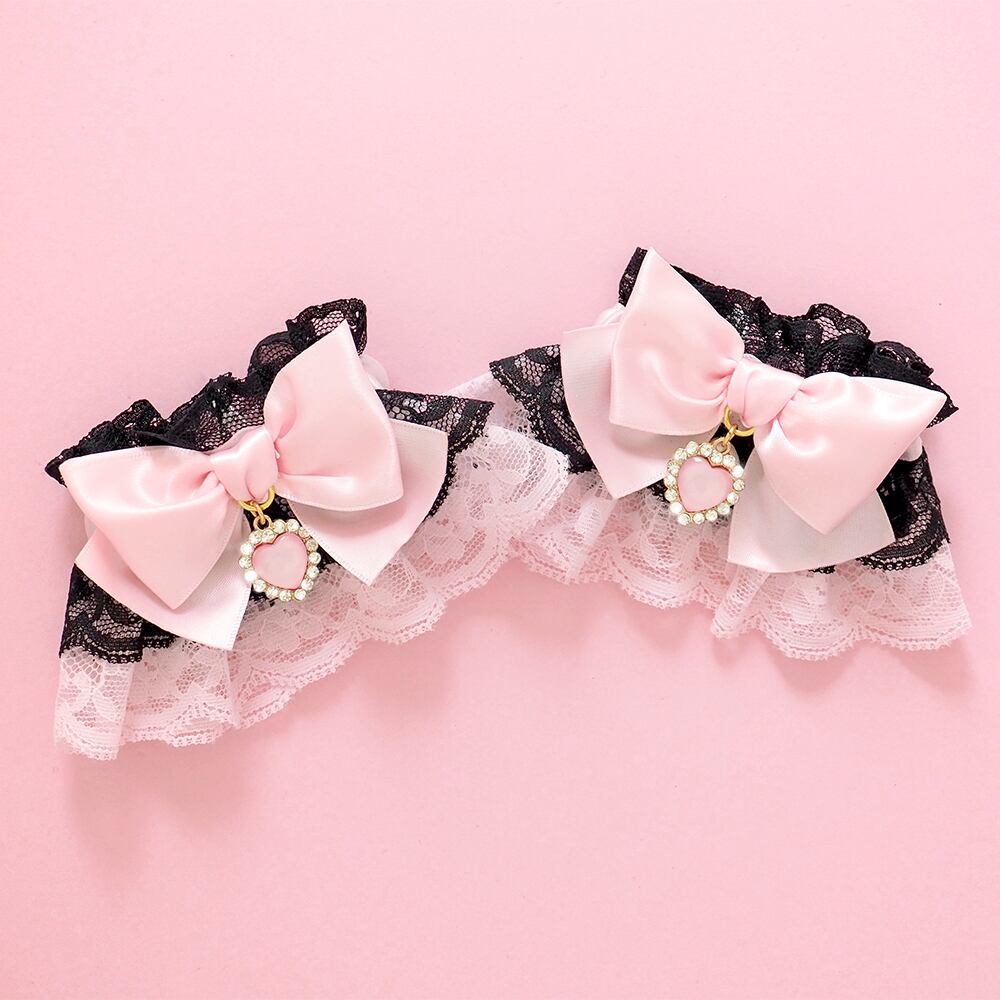 お袖留め 付け カフス ハートラインストーンチャーム ブラックレース ベビーピンク