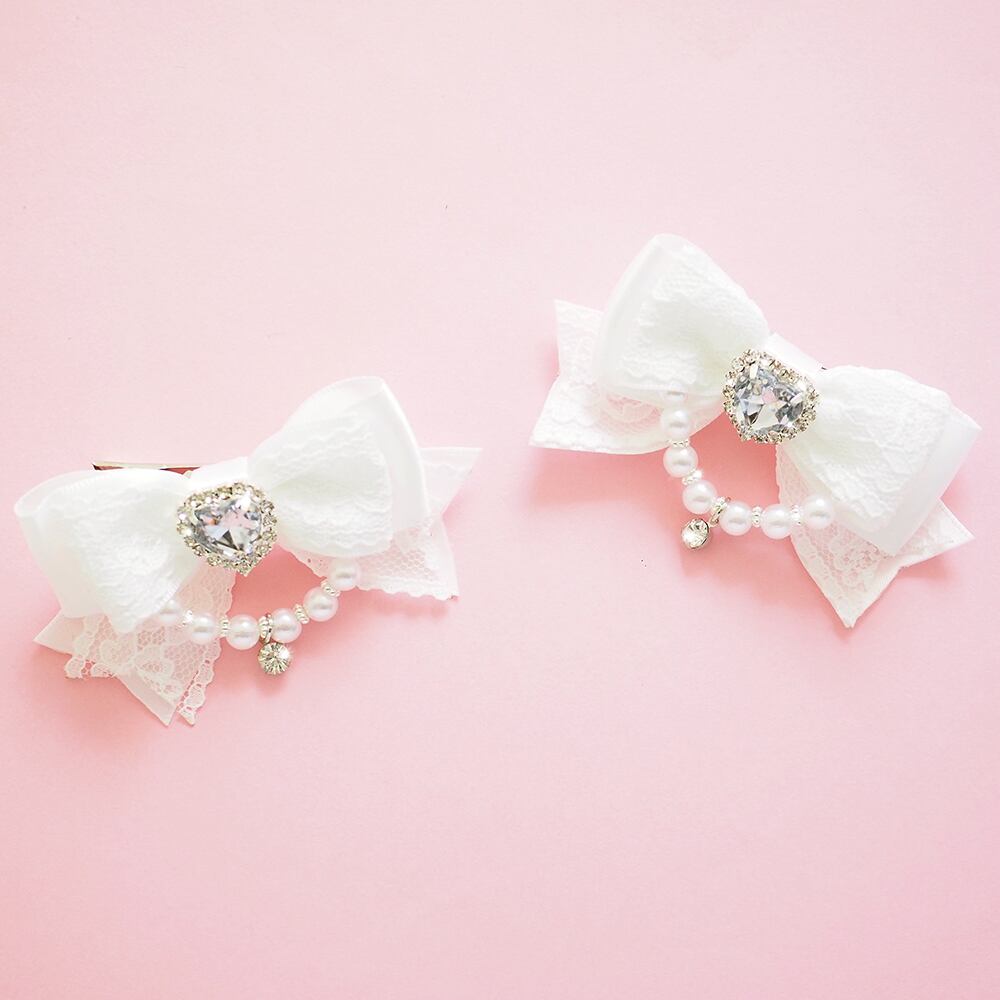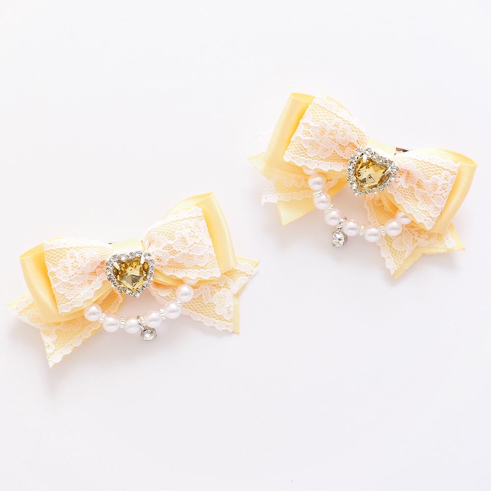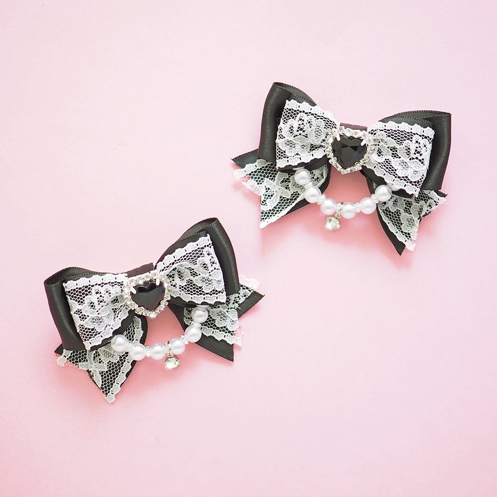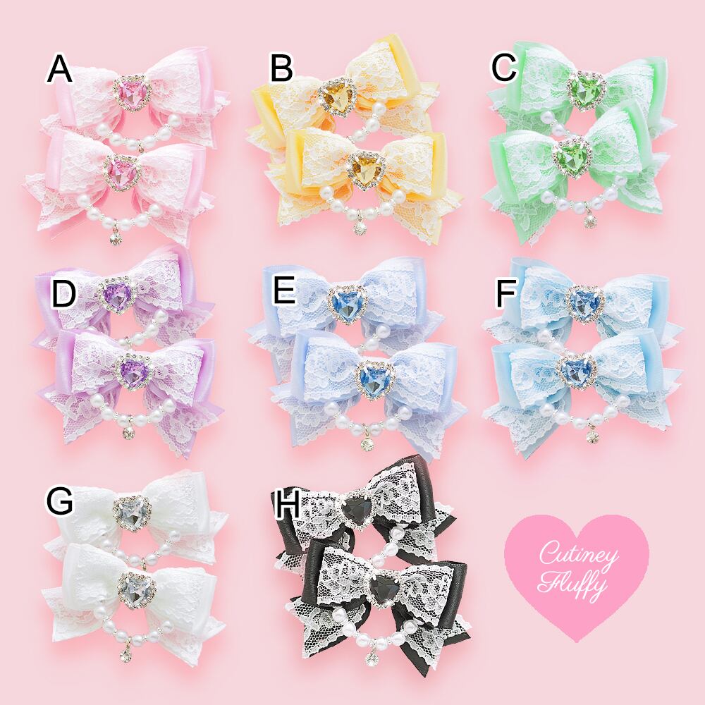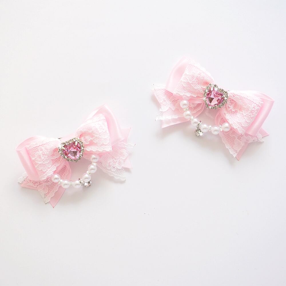 量産型 推し色 地雷 ハートビジュー パール飾り ヘアクリップ ヘアリボン 2個セット