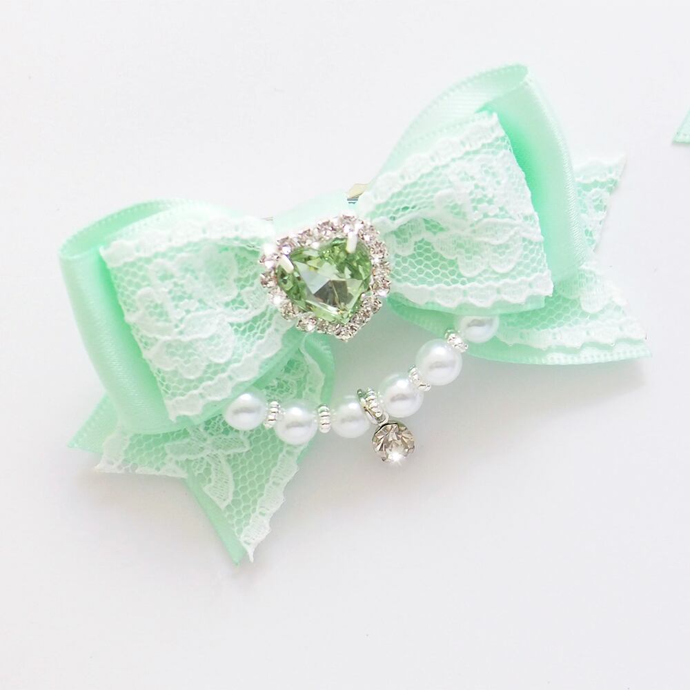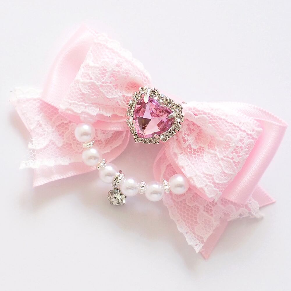 レースを重ねたサテンリボンにラインストーンチャームをあしらったヘアクリップです。