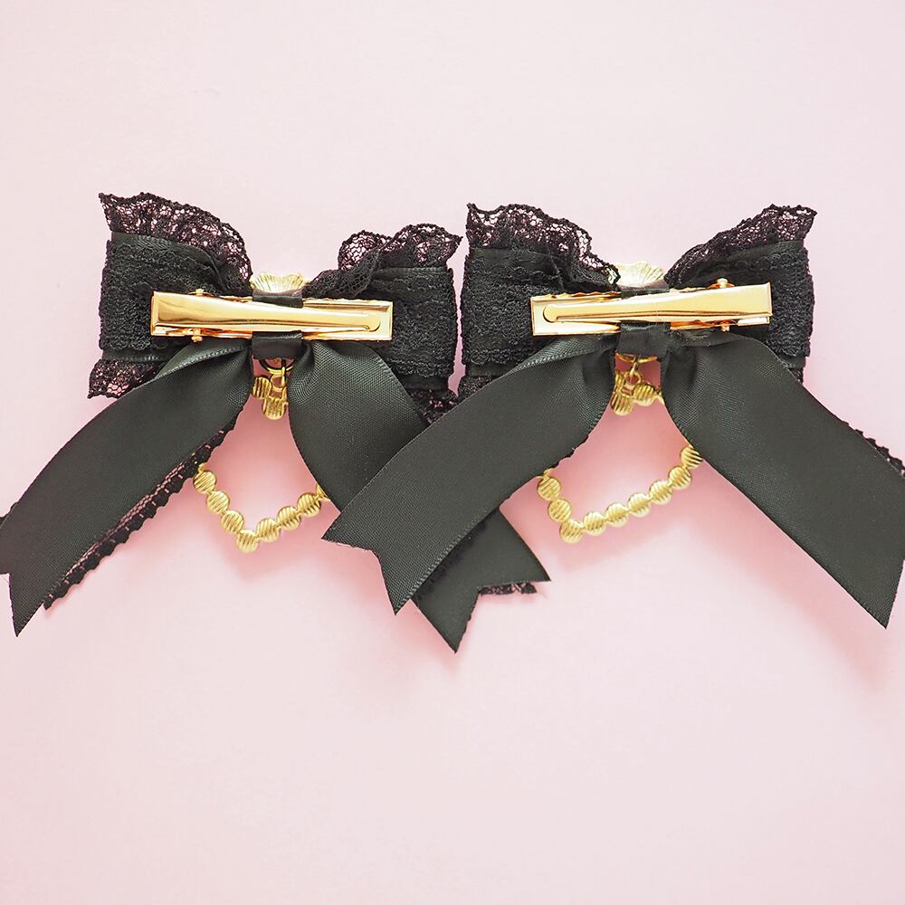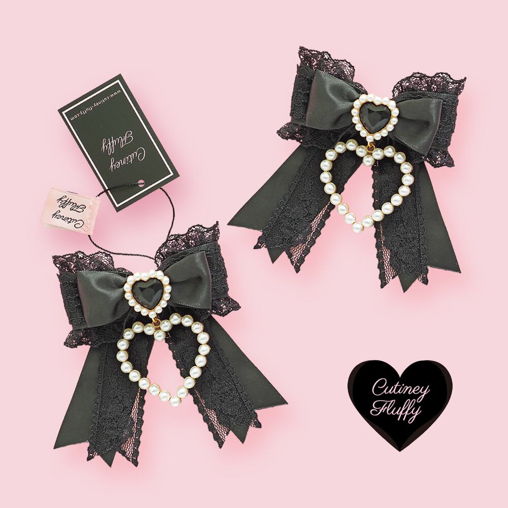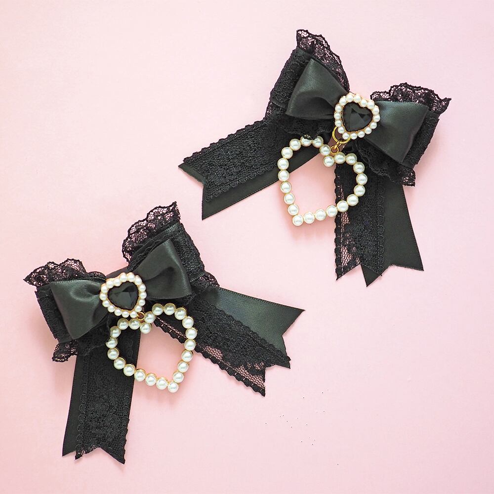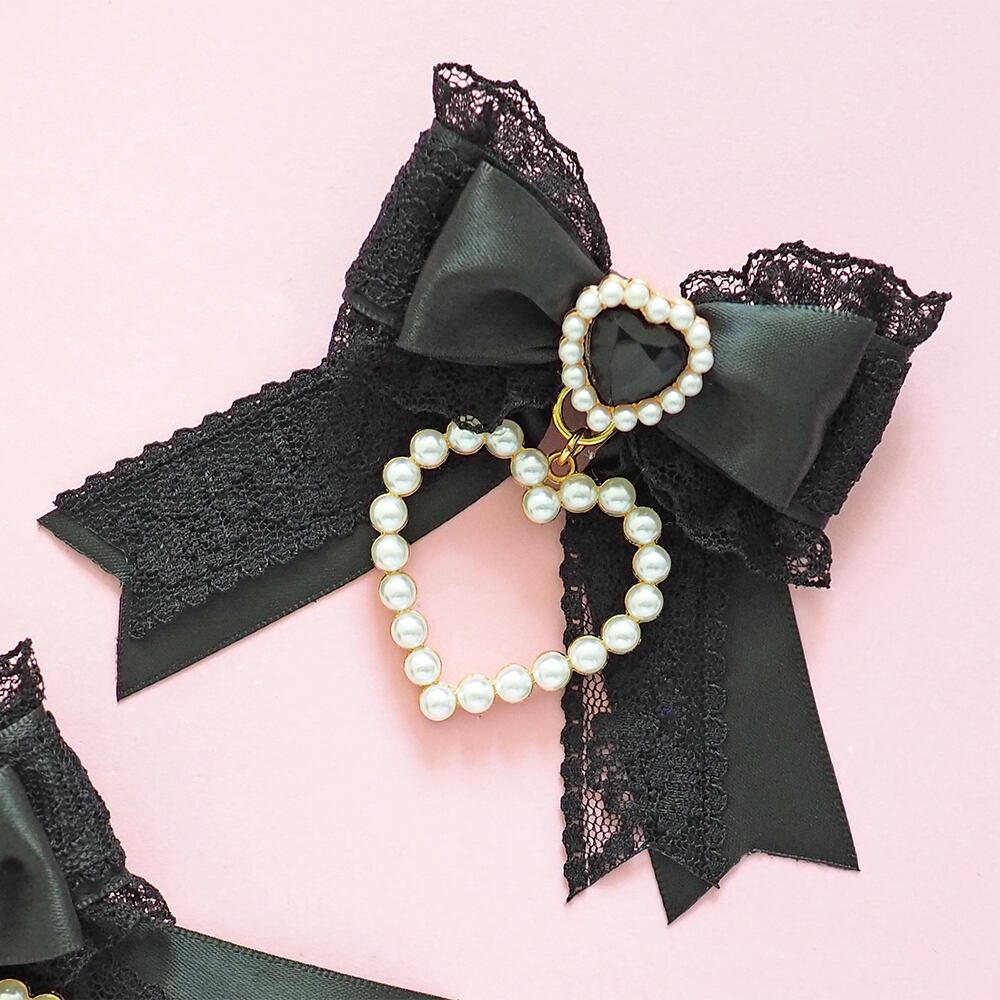 ハートパールチャーム フリルリボン ヘアクリップ 2点セット ブラックレース 黒