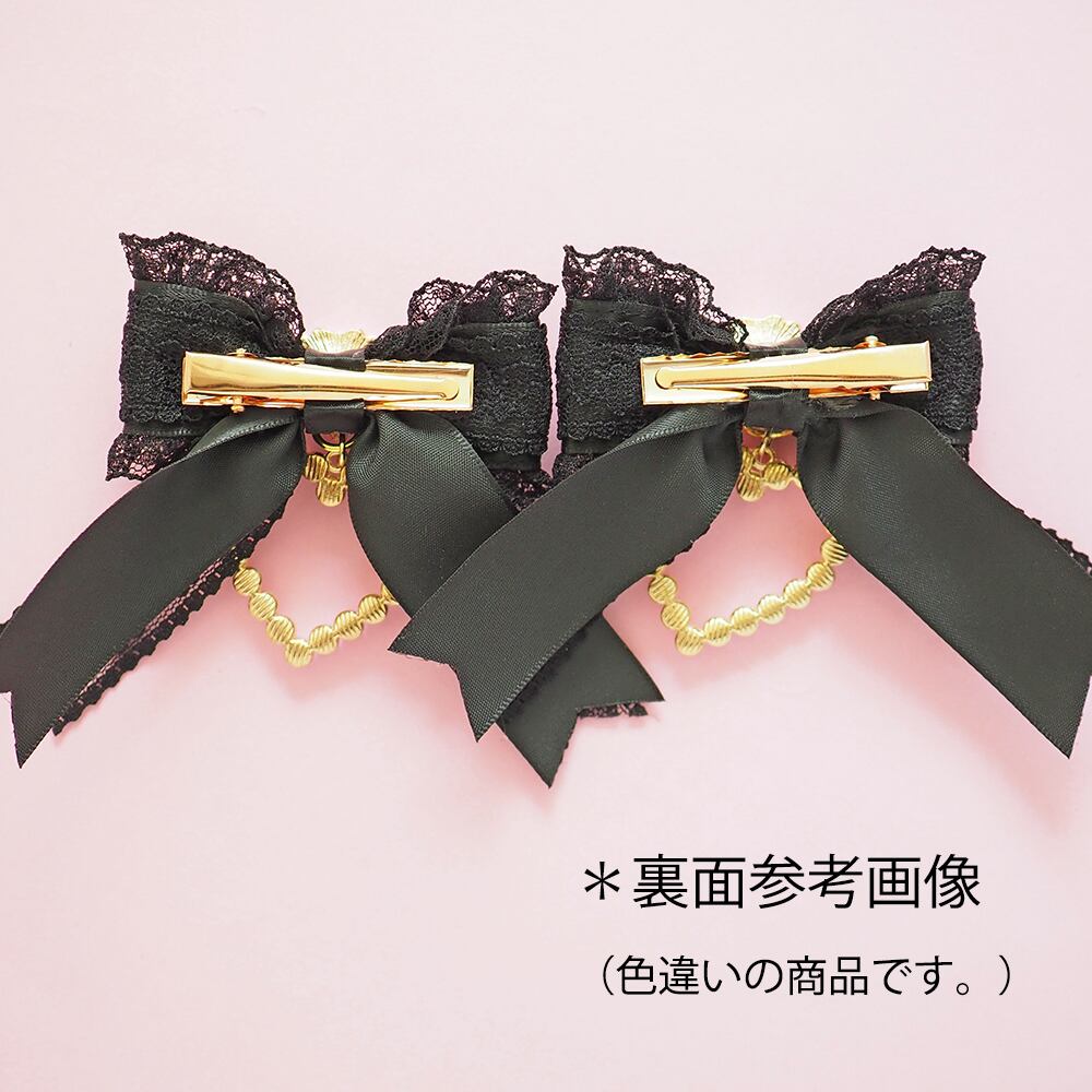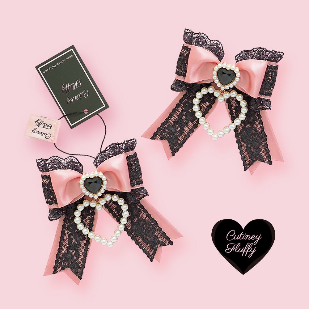 ハートパールチャーム フリルリボン ヘアクリップ 2点セット ブラックレース ピンク