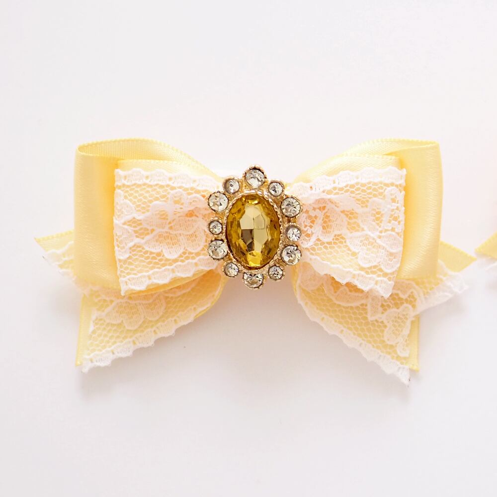 レースを重ねたサテンリボンにビジューをあしらったヘアクリップです。
