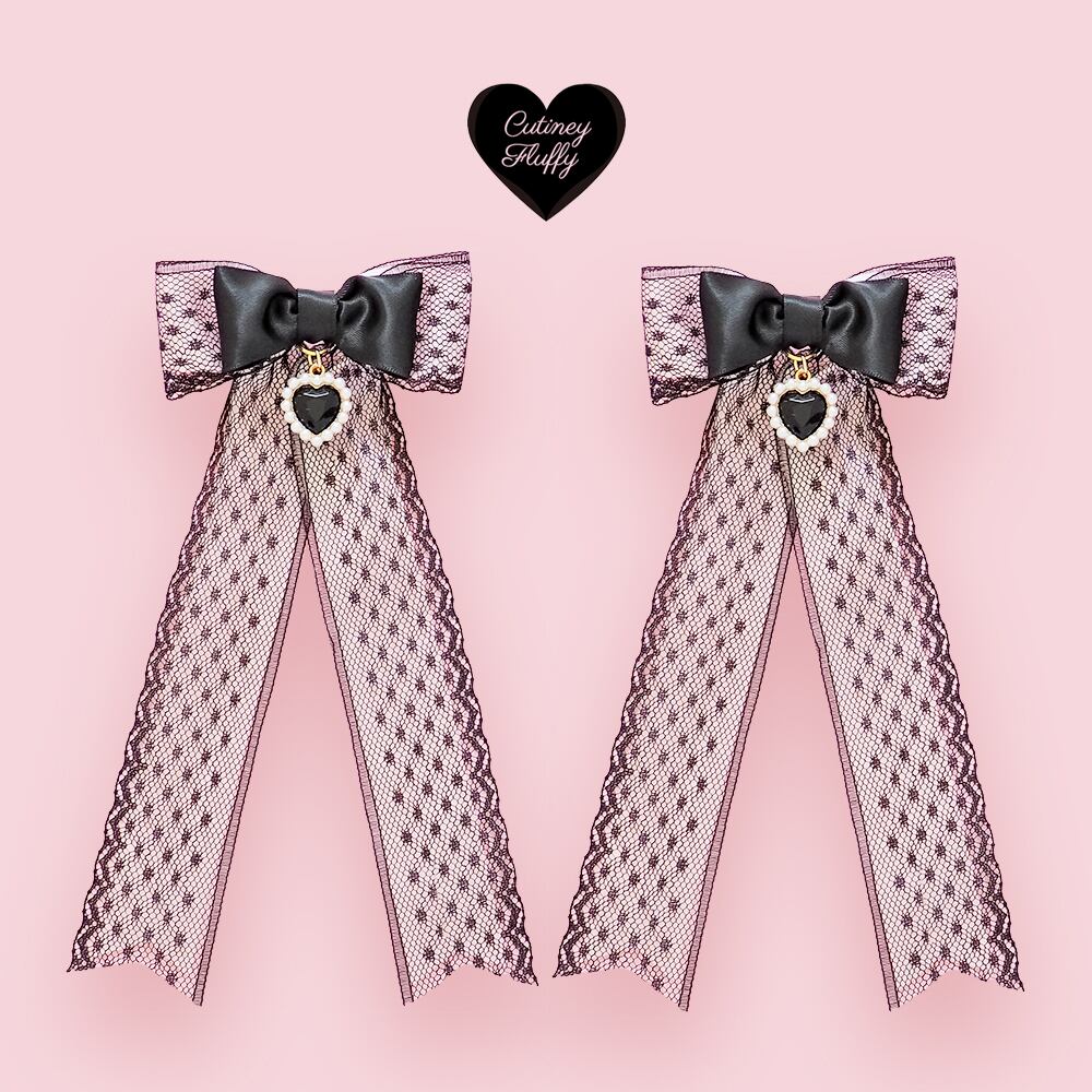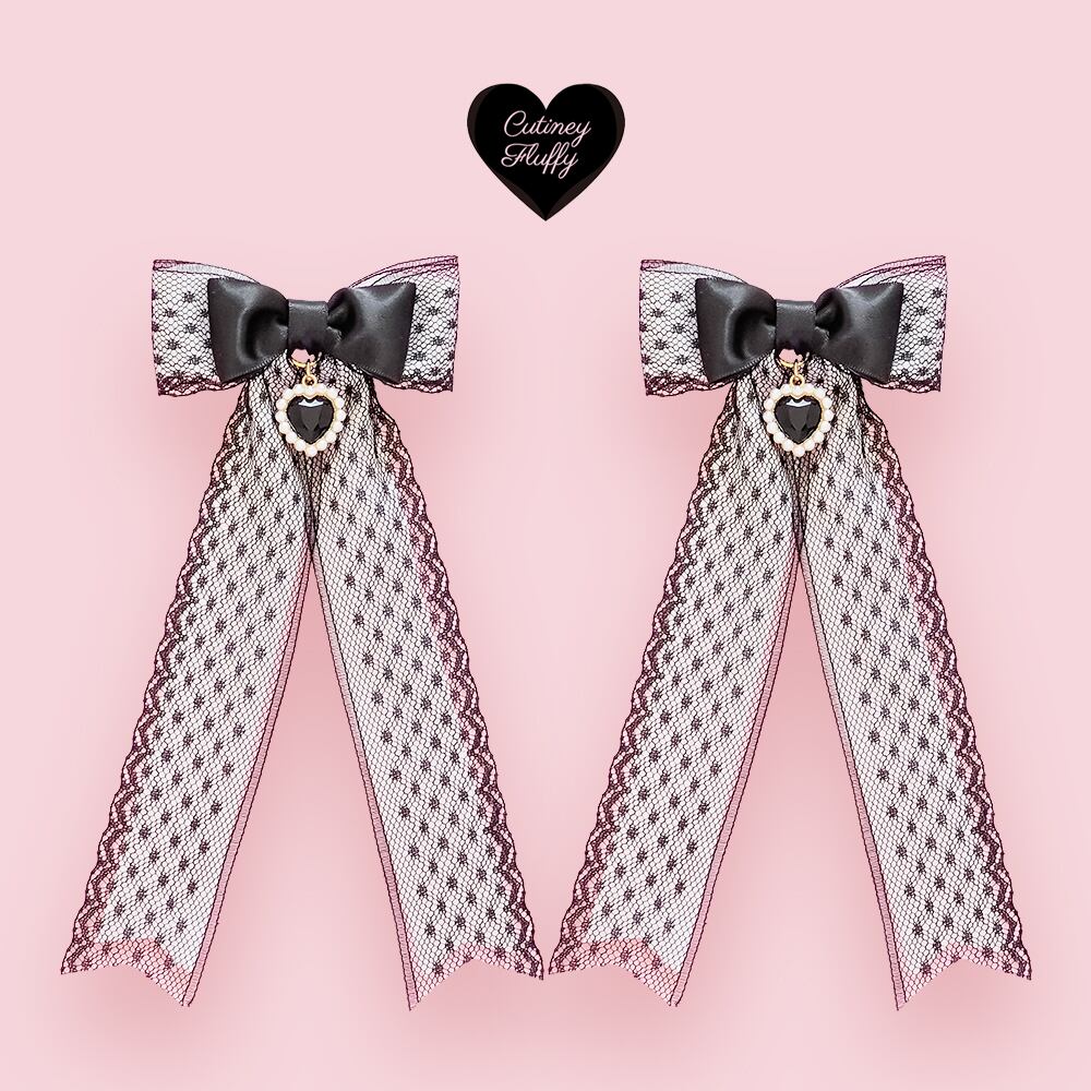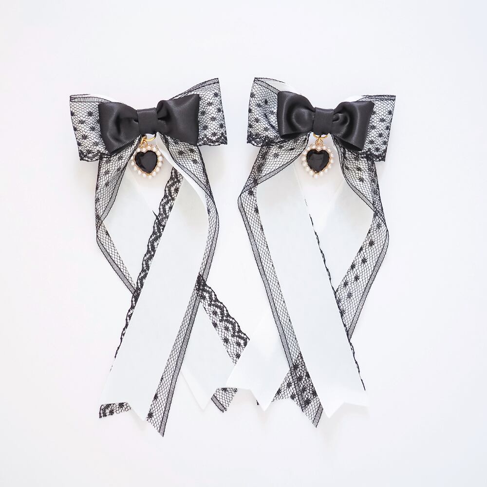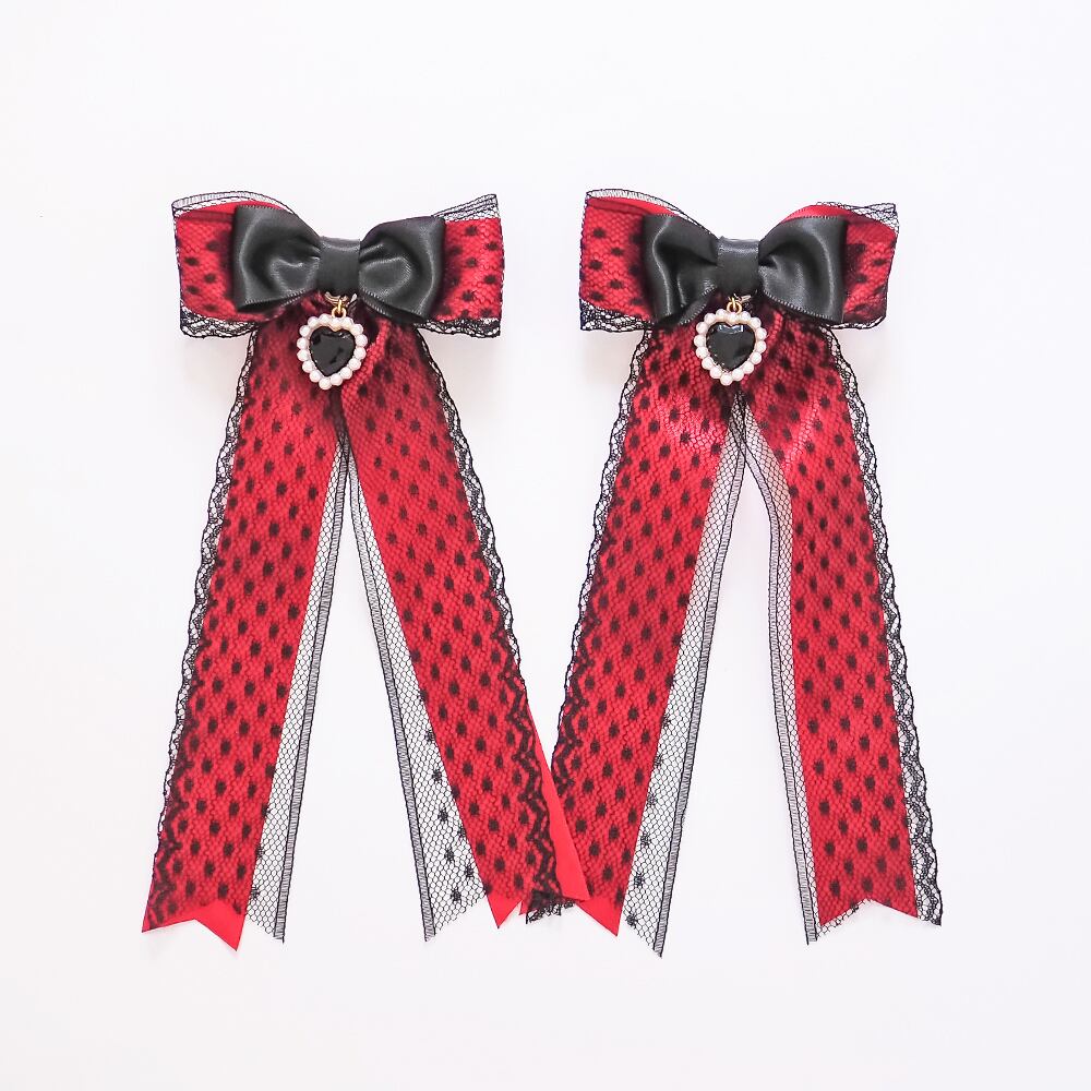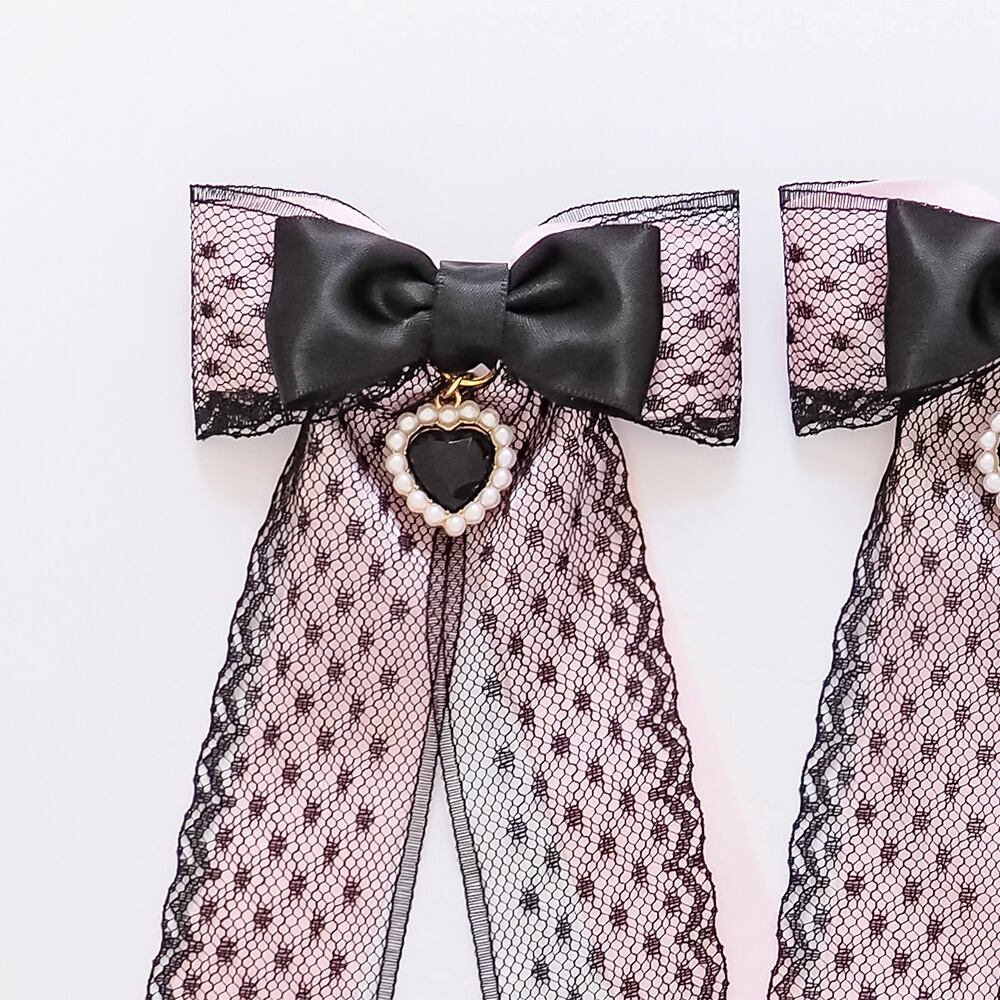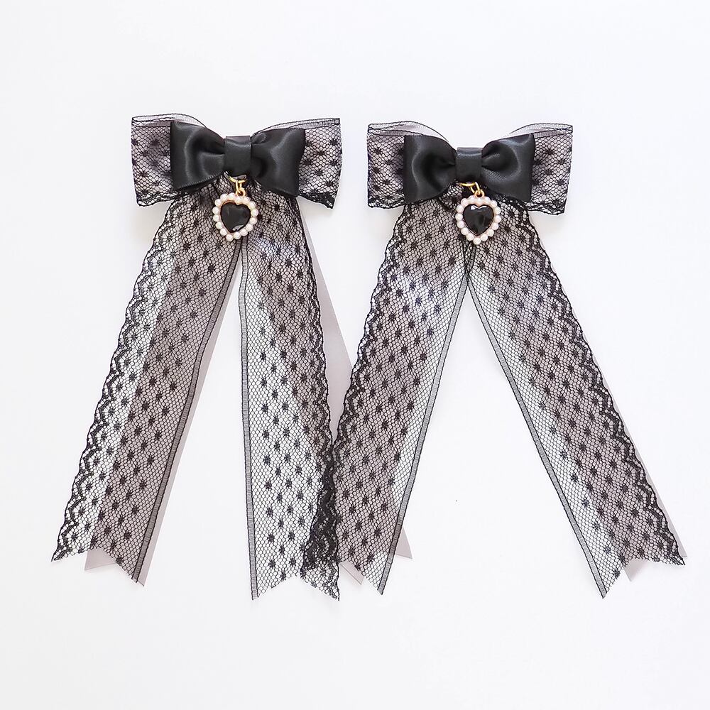 ドット ブラック チュール レース ヘアクリップ ヘアリボン ロング 2個セット ツインテール