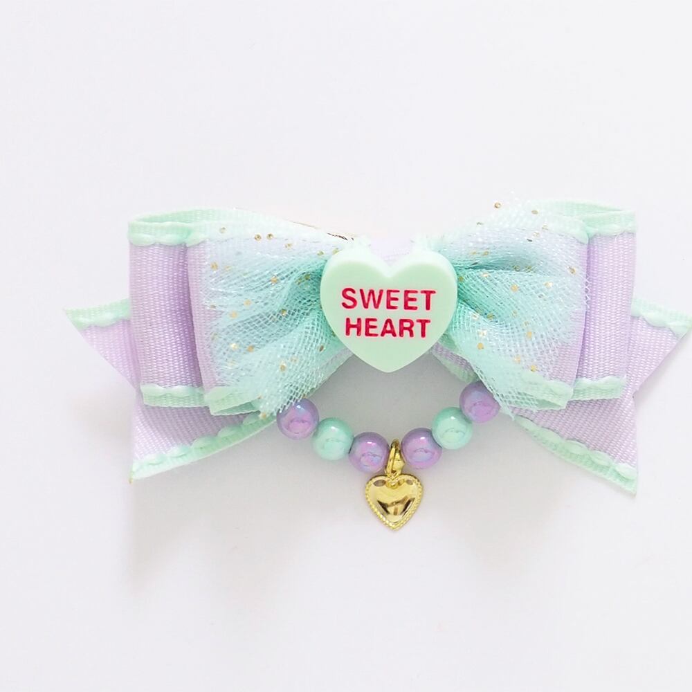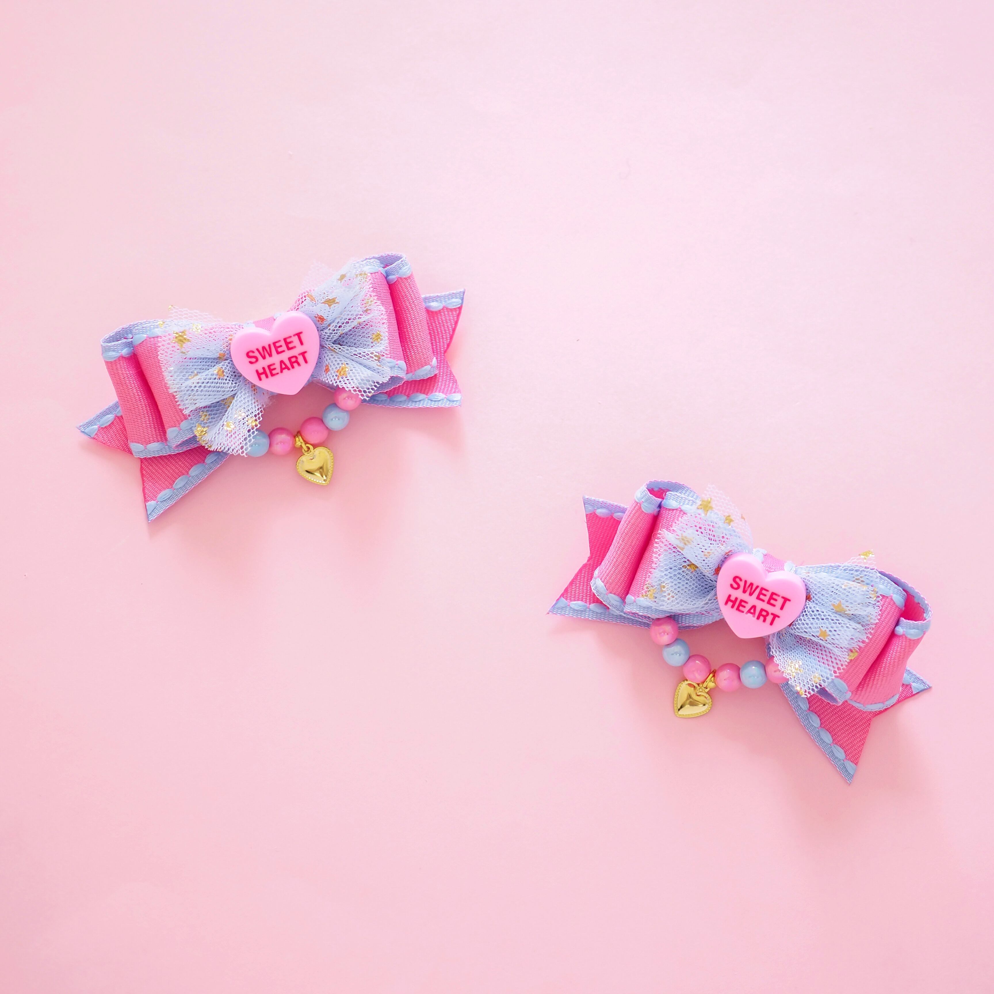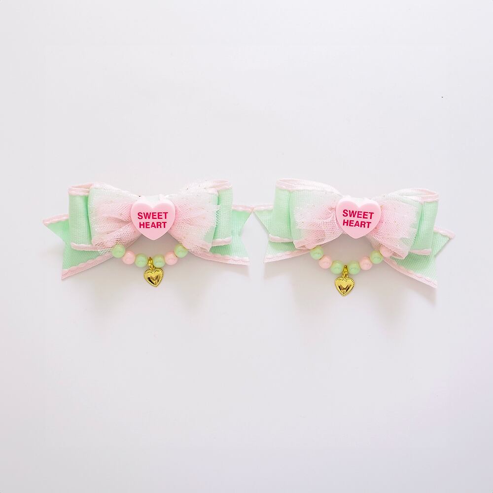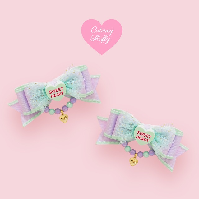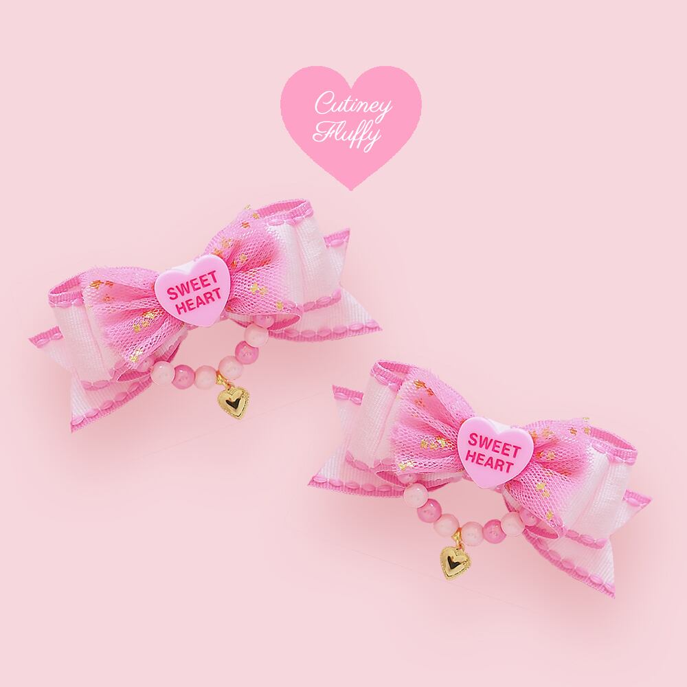 チュール リボン ヘアクリップ ハート パール飾り ヘアリボン 2個セット パステルカラー