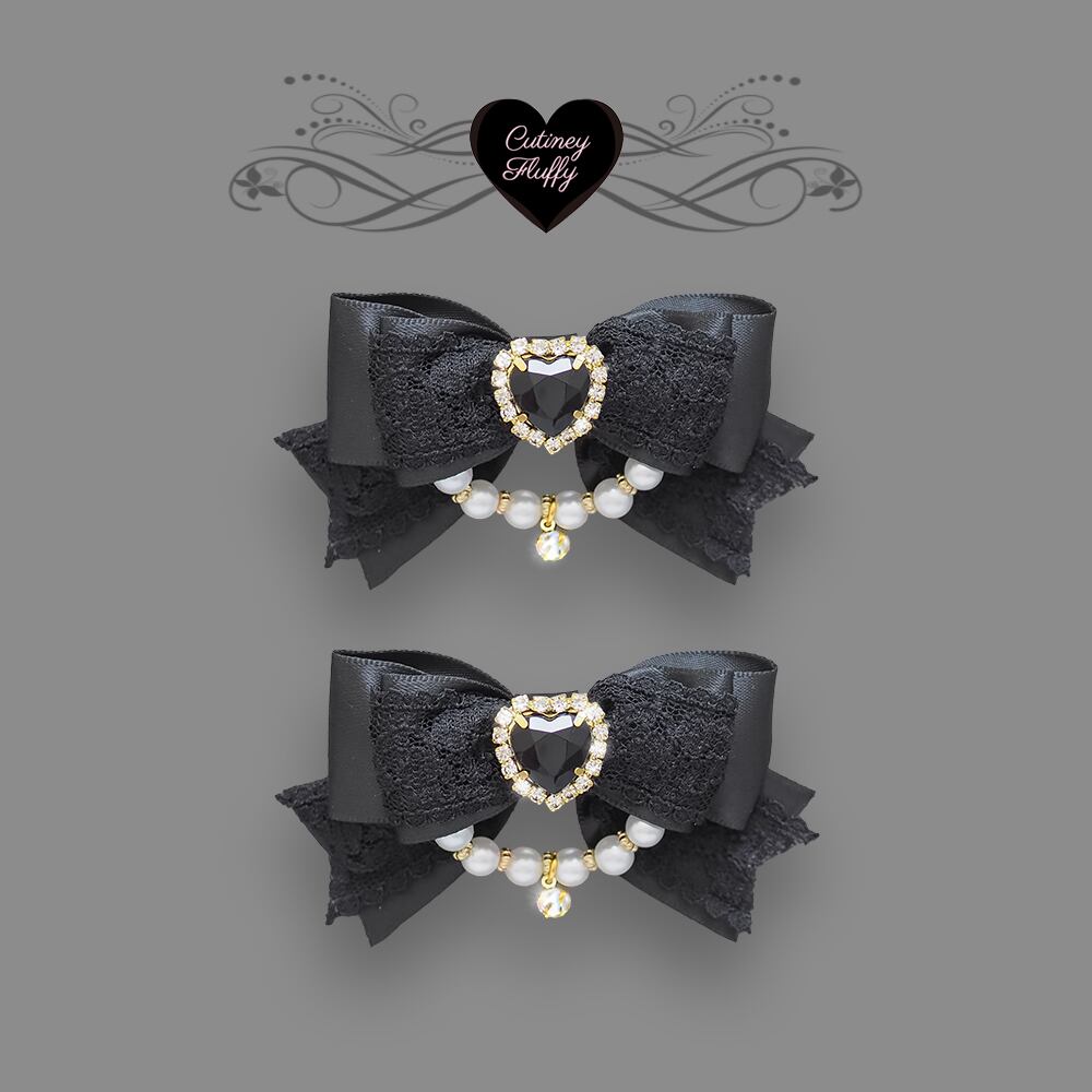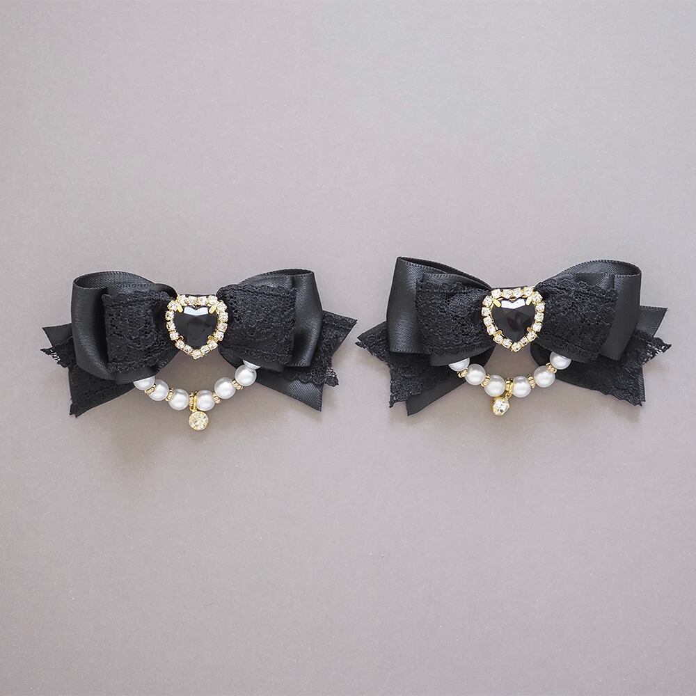 ハートビジュー パール飾り ヘアクリップ ヘアリボン ブラックレース 2個セット 黒