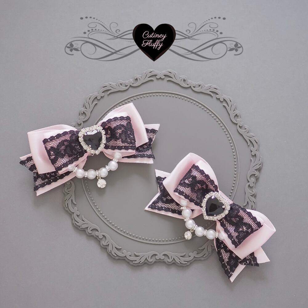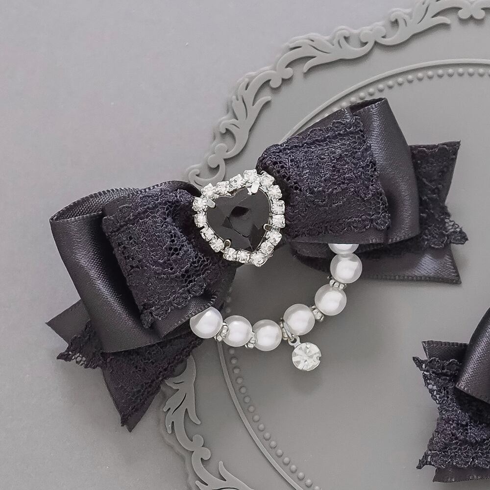 ハートビジュー パール飾り ヘアクリップ ヘアリボン ブラックレース 2個セット 地雷