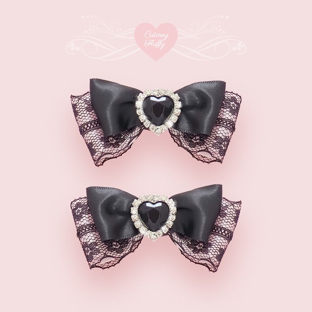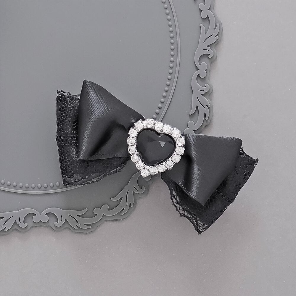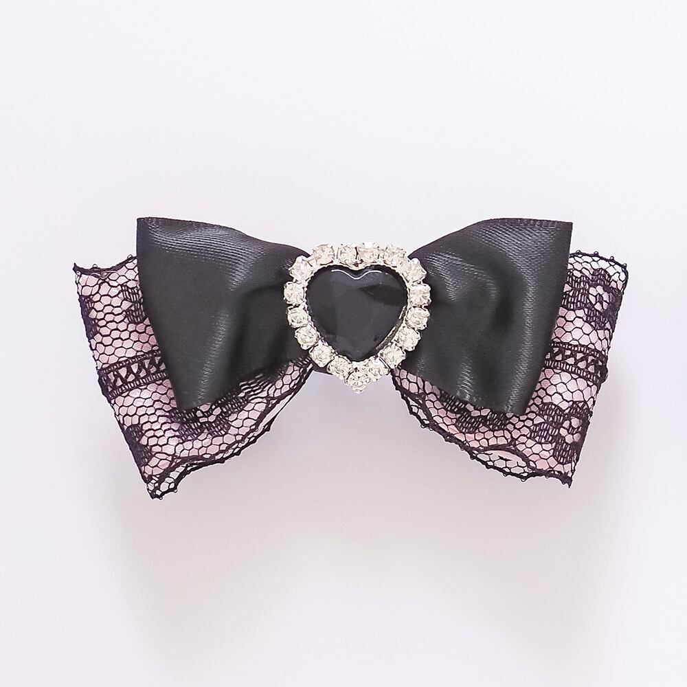 ブラックレースを重ねたサテンリボンにハートのラインビジューをあしらったヘアクリップです。