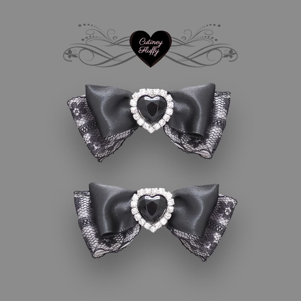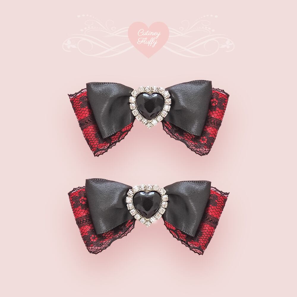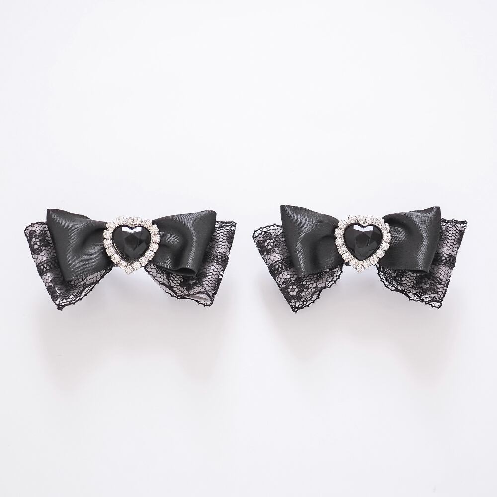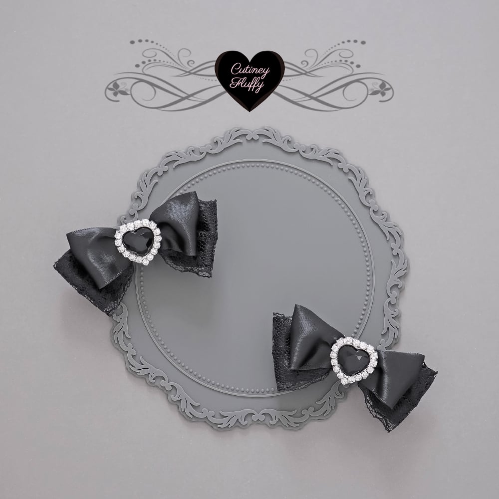 ブラックレースを重ねたサテンリボンにハートのラインビジューをあしらったヘアクリップです。
