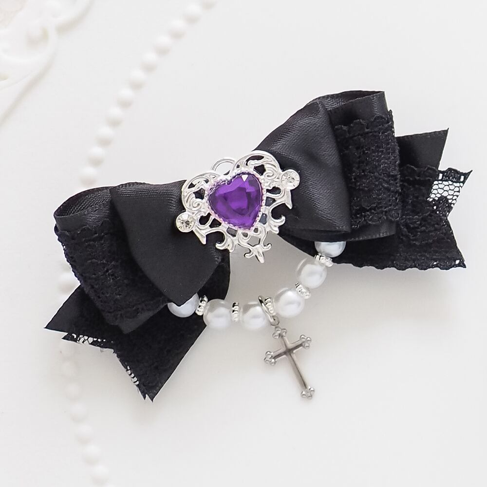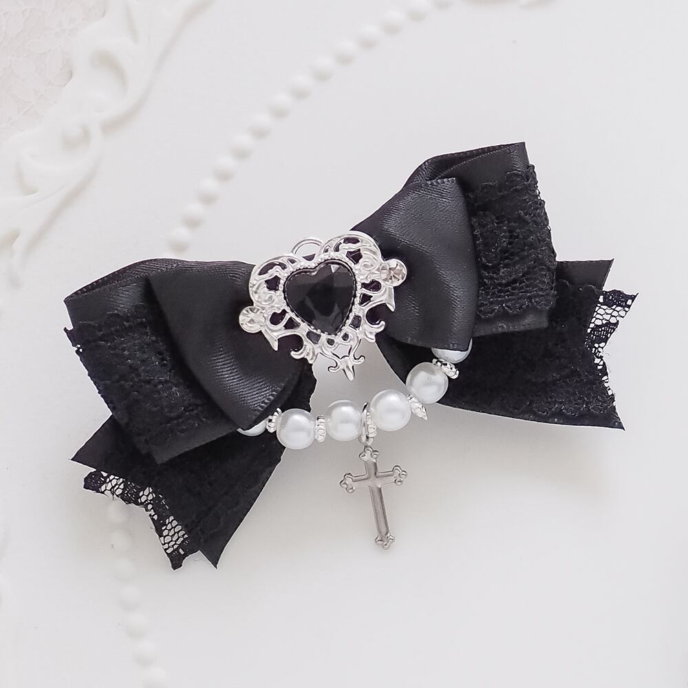 レースを重ねたサテンリボンにパール飾り、ビーズ、十字架チャームをあしらったヘアクリップです。