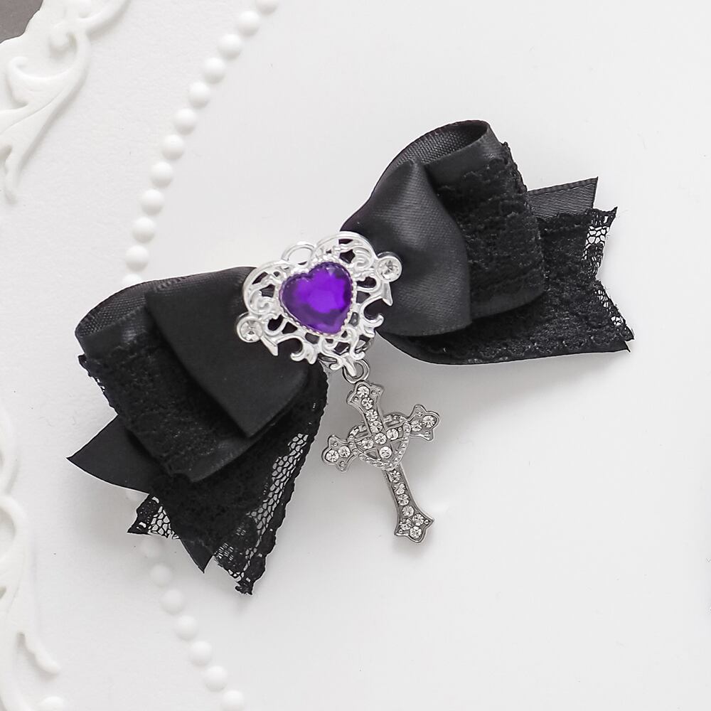 レースを重ねたサテンリボンに十字架チャームをあしらったヘアクリップです。
